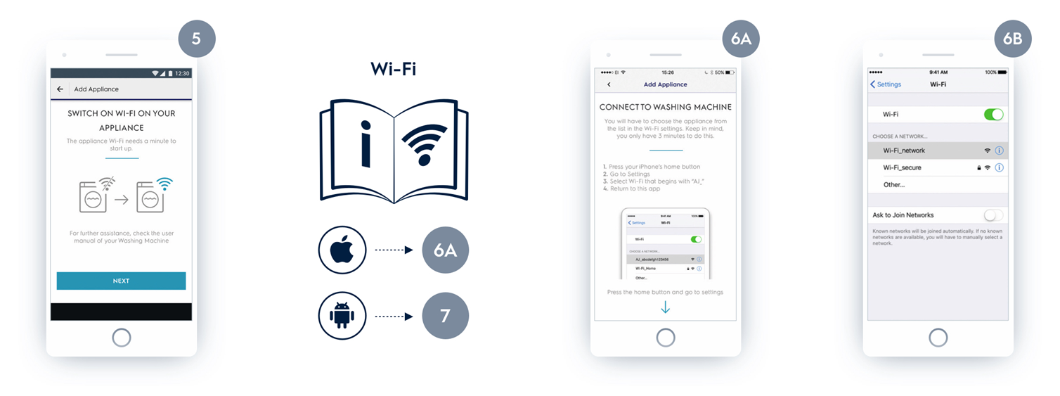 5. Activez le wifi sur l'appareil. Pour activer le wifi sur la machine, consultez la section 'Configuration de la connectivité wifi' du manuel.