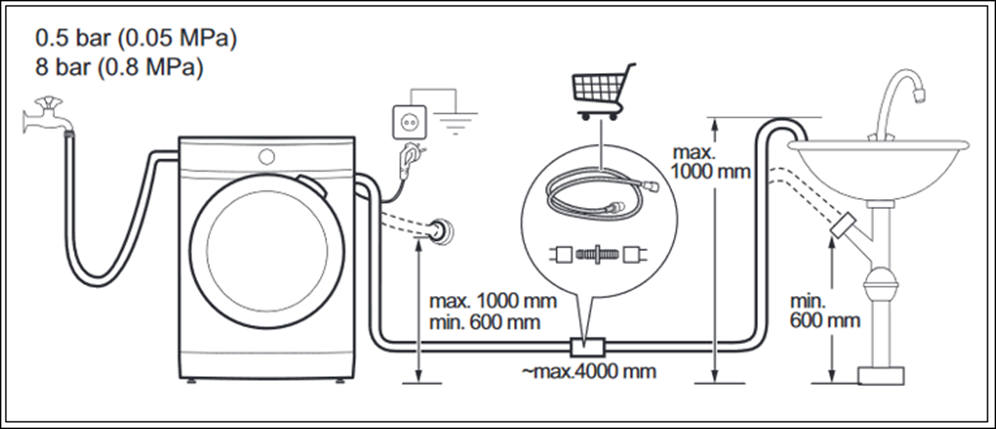 - Zorg voor de juiste afvoerhoogte. De hoogte van de afvoer mag niet hoger zijn dan 100 cm en niet lager dan 60 cm boven de onderkant van de machine. Als de afvoer te hoog of te laag is kan de afvoerpomp het op te pompen water niet verwerken.